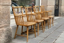 Kinder-Gartenstuhl zum Klappen Klappbarer Kinder-Gartenstuhl aus Holz mit Armlehnen aus den 50er-Jahren, wohl von Herlag oder Naether. Sitzhöhe 33cm, Höhe 59cm, Breite 48cm, Tiefe 43cm, Alters- und Gebrauchsspuren. Preis: EUR 30,00