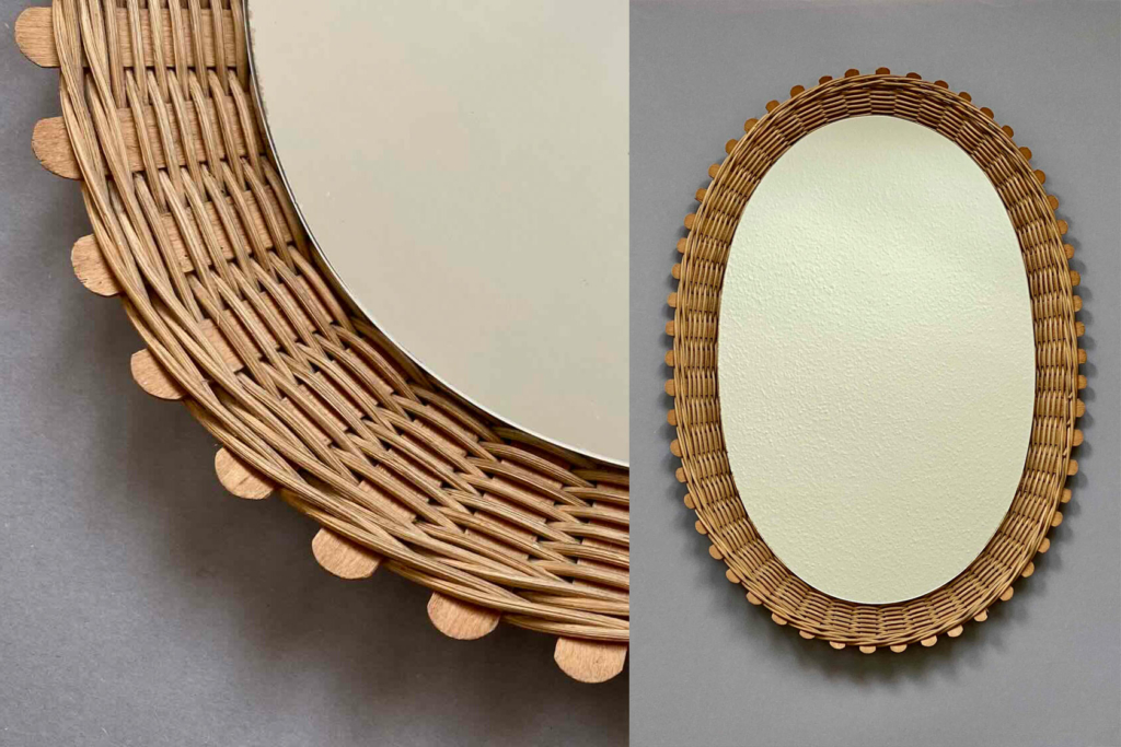 Ovaler Spiegel mit Rattanrahmen Der Spiegel mit dem geflochtenem Rahmen aus Rattan und Teakholz stammt aus den 50er- oder 60er-Jahren. Stabile Rückseite aus Holz, Spiegelglas Höhe 37cm, Breite 28cm, Rahmen Höhe 52cm, Breite 37cm; minimale Beschädigung (s. Foto). Preis: EUR 55,00