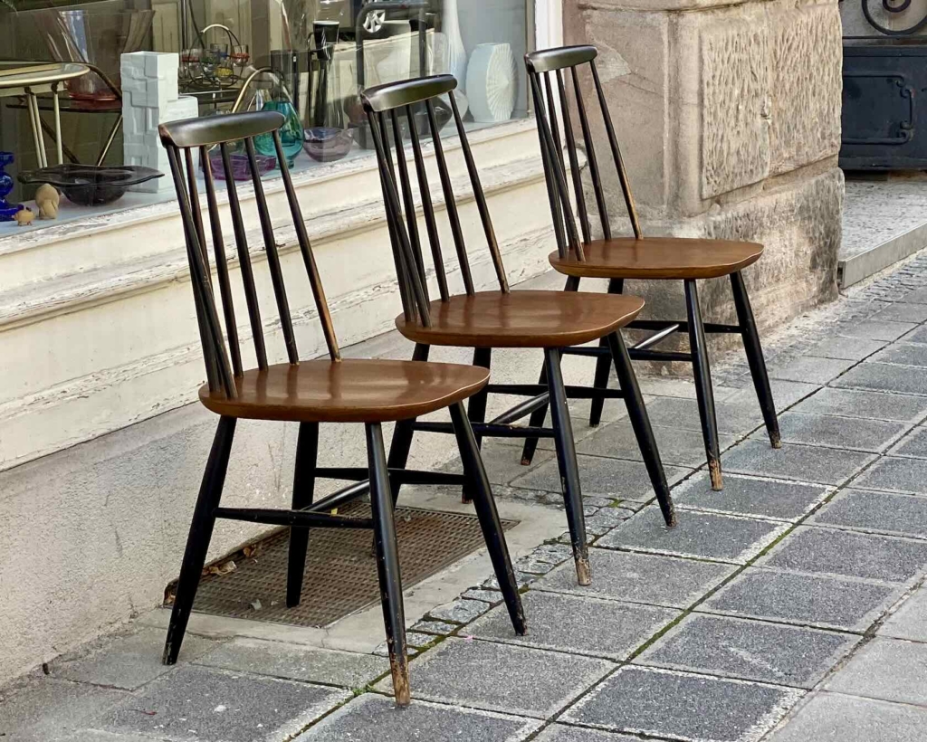 Die Stühle ähneln dem „Fanett“-Stuhl von Ilmari Tapiovaara für Asko und stammen wohl aus den 50er- oder 60er-Jahren. Material Buchenholz, schwarz lackiert, sowie teakfurniertes Sperrholz, Sitzfläche ergonomisch geformt. Sitzhöhe 45cm, Höhe 85cm, Breite 43cm, Tiefe 47cm; z.T. mit deutlichen Gebrauchsspuren (s. Fotos).