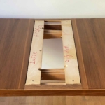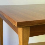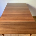 Ausziehbarer Esstisch der Firma Lübke aus den 50er-Jahren mit zwei Platten zum Ausziehen und leicht konischen Vierkantbeinen. Material Nussbaum und Nussbaumfurnier, Tischplatte Pressspan, furniert und glänzend lackiert. Höhe 74,5cm, Höhe bis Rahmen 63cm; Breite 125/221cm, Tiefe 84,5cm; Gebrauchsspuren, Lack der Tischplatte mit Craquelé und Beschädigungen (s. Foto), die Tischplatte liegt nicht völlig plan auf wenn der Tisch ausgezogen ist, Ausziehplatten mit etwas anderem Farbton. Der Tisch lässt sich für den Transport mit wenigen Handgriffen komplett aueinanderbauen.