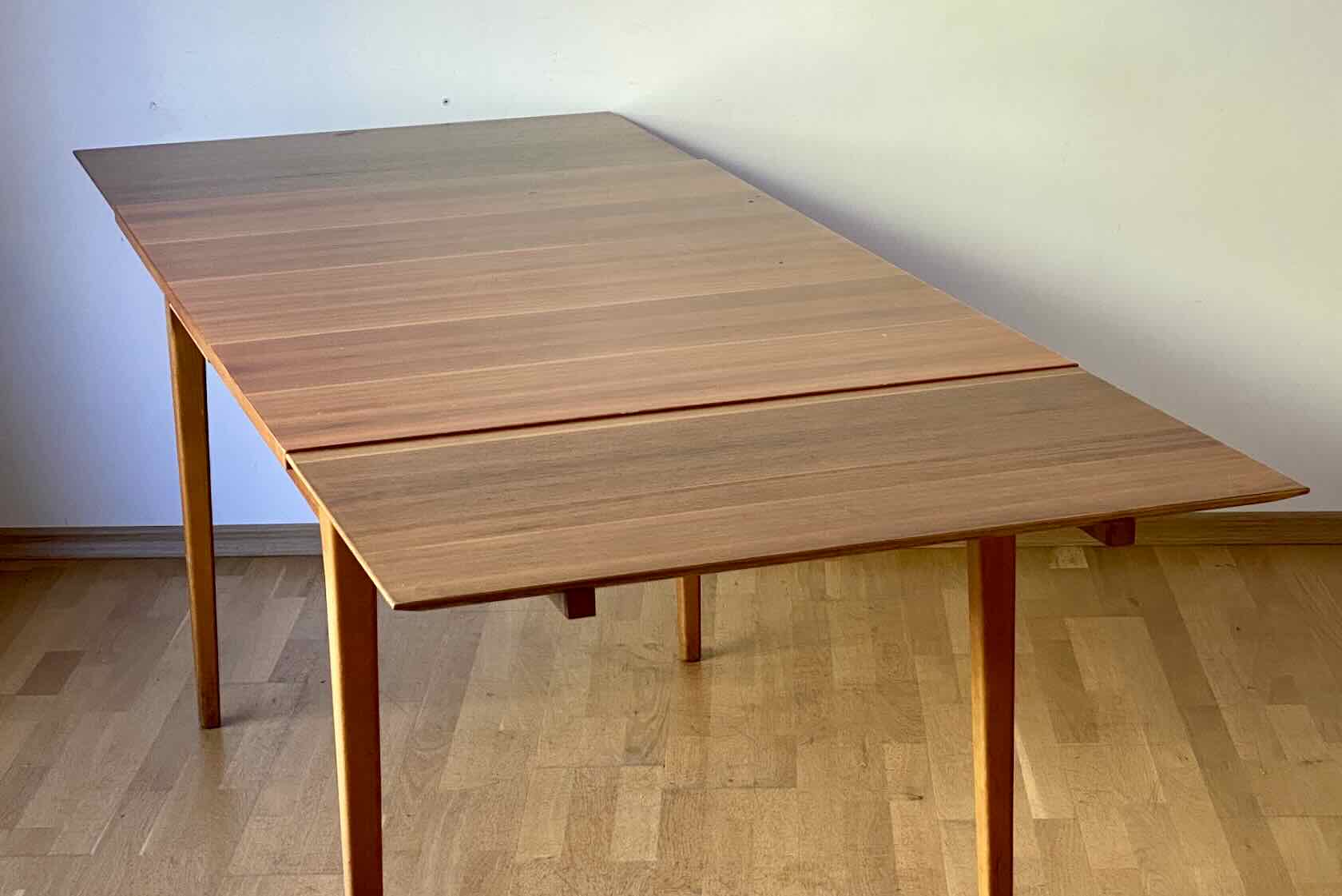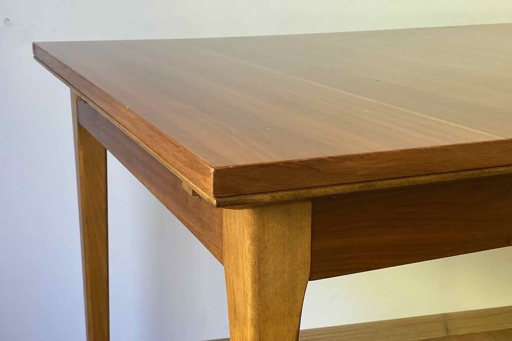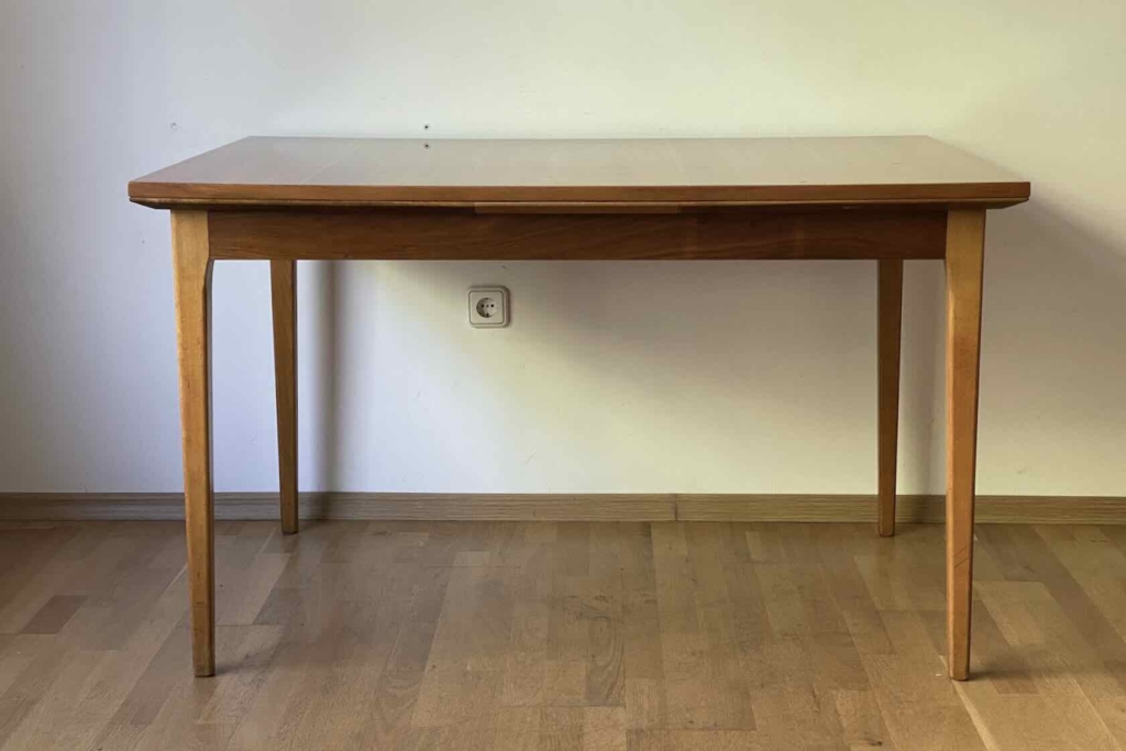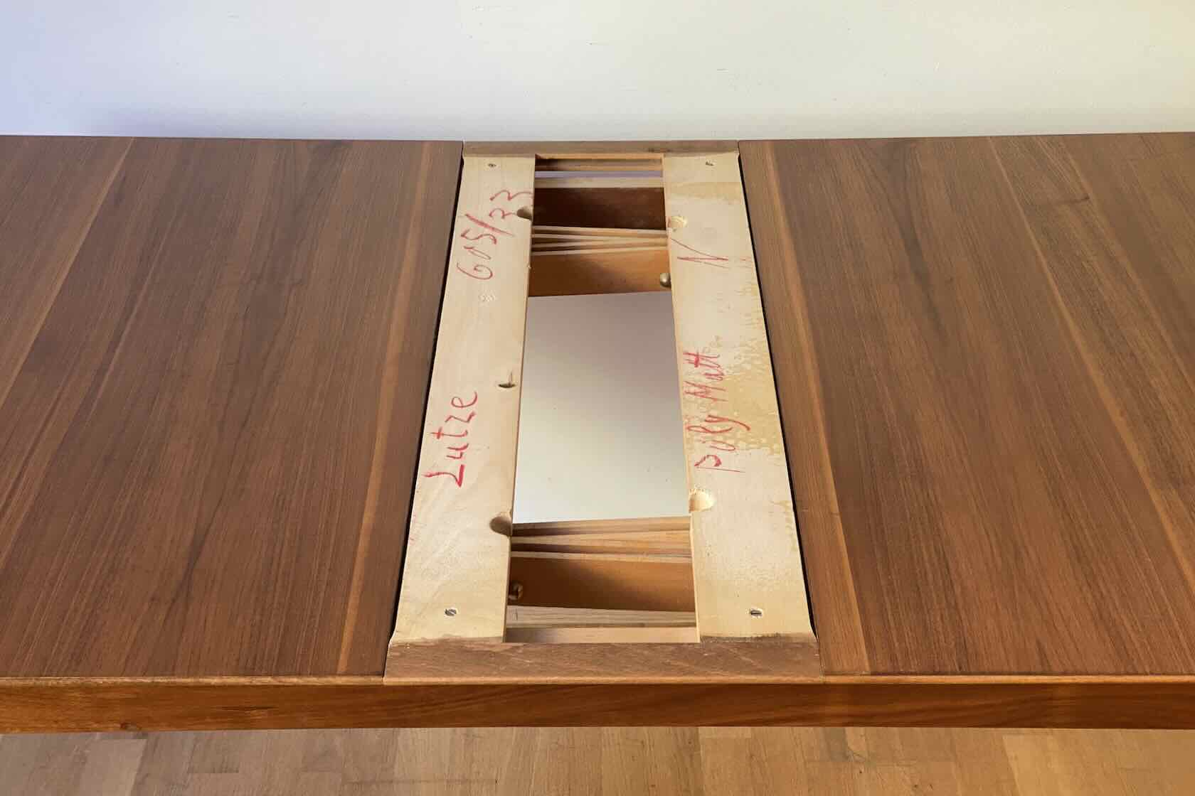 Ausziehbarer Esstisch der Firma Lübke aus den 50er-Jahren mit zwei Platten zum Ausziehen und leicht konischen Vierkantbeinen. Material Nussbaum und Nussbaumfurnier, Tischplatte Pressspan, furniert und glänzend lackiert. Höhe 74,5cm, Höhe bis Rahmen 63cm; Breite 125/221cm, Tiefe 84,5cm; Gebrauchsspuren, Lack der Tischplatte mit Craquelé und Beschädigungen (s. Foto), die Tischplatte liegt nicht völlig plan auf wenn der Tisch ausgezogen ist, Ausziehplatten mit etwas anderem Farbton. Der Tisch lässt sich für den Transport mit wenigen Handgriffen komplett aueinanderbauen.