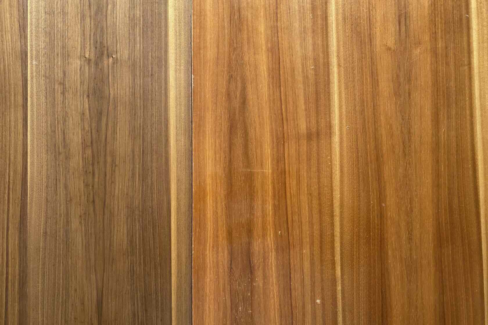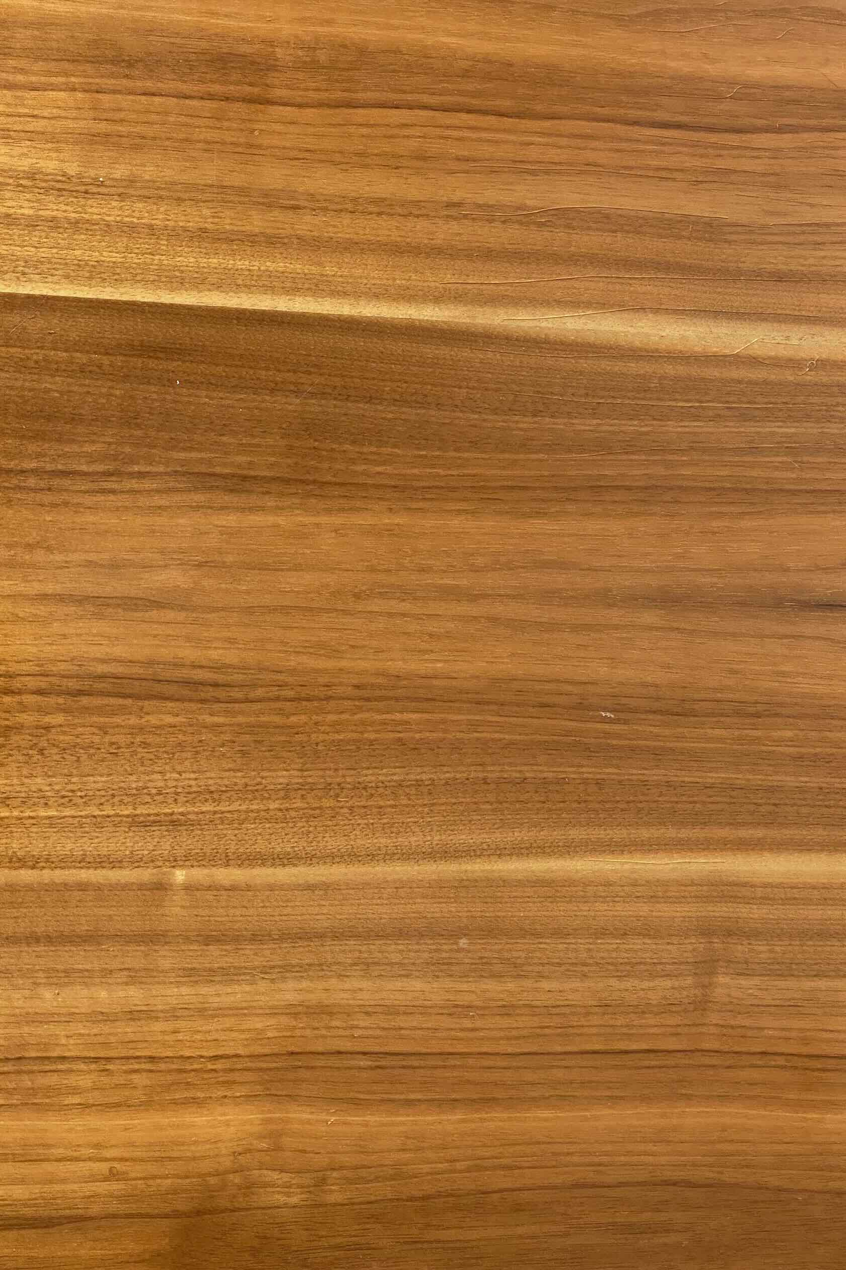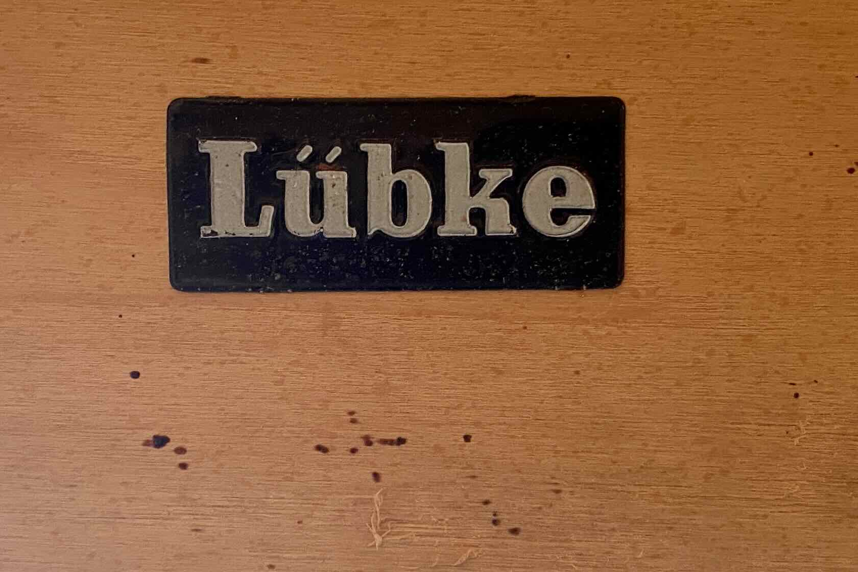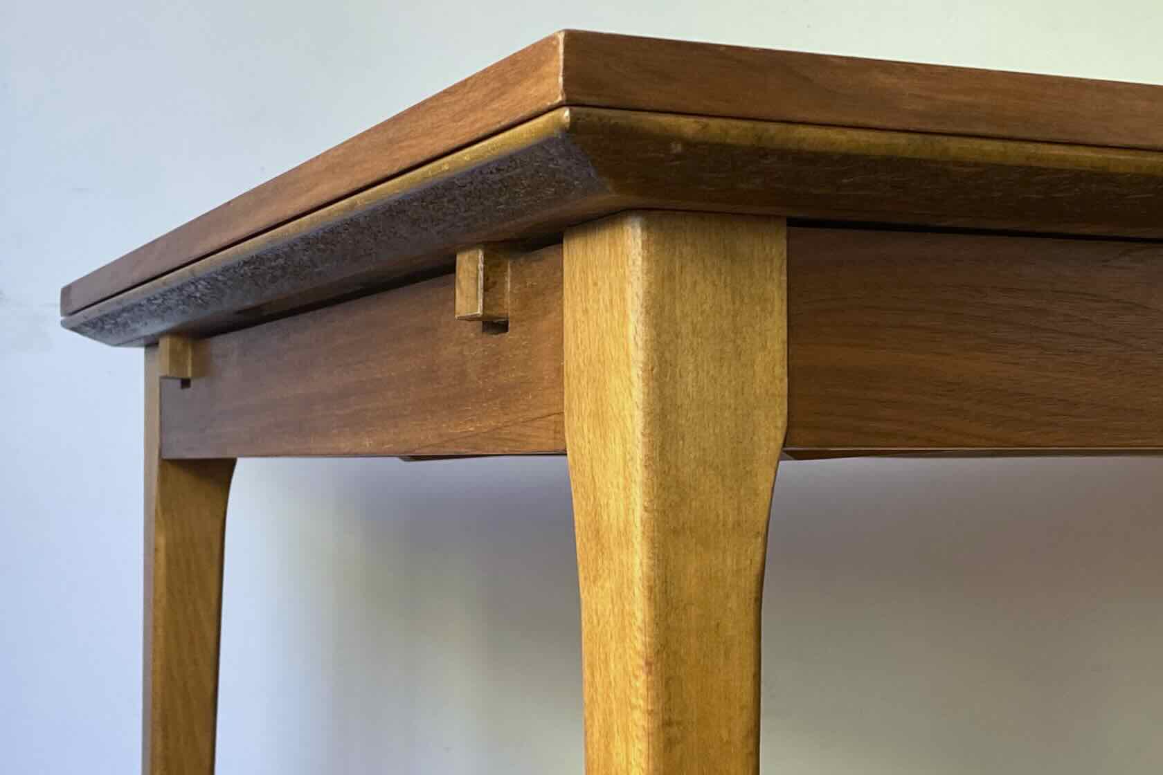 Ausziehbarer Esstisch der Firma Lübke aus den 50er-Jahren mit zwei Platten zum Ausziehen und leicht konischen Vierkantbeinen. Material Nussbaum und Nussbaumfurnier, Tischplatte Pressspan, furniert und glänzend lackiert. Höhe 74,5cm, Höhe bis Rahmen 63cm; Breite 125/221cm, Tiefe 84,5cm; Gebrauchsspuren, Lack der Tischplatte mit Craquelé und Beschädigungen (s. Foto), die Tischplatte liegt nicht völlig plan auf wenn der Tisch ausgezogen ist, Ausziehplatten mit etwas anderem Farbton. Der Tisch lässt sich für den Transport mit wenigen Handgriffen komplett aueinanderbauen.