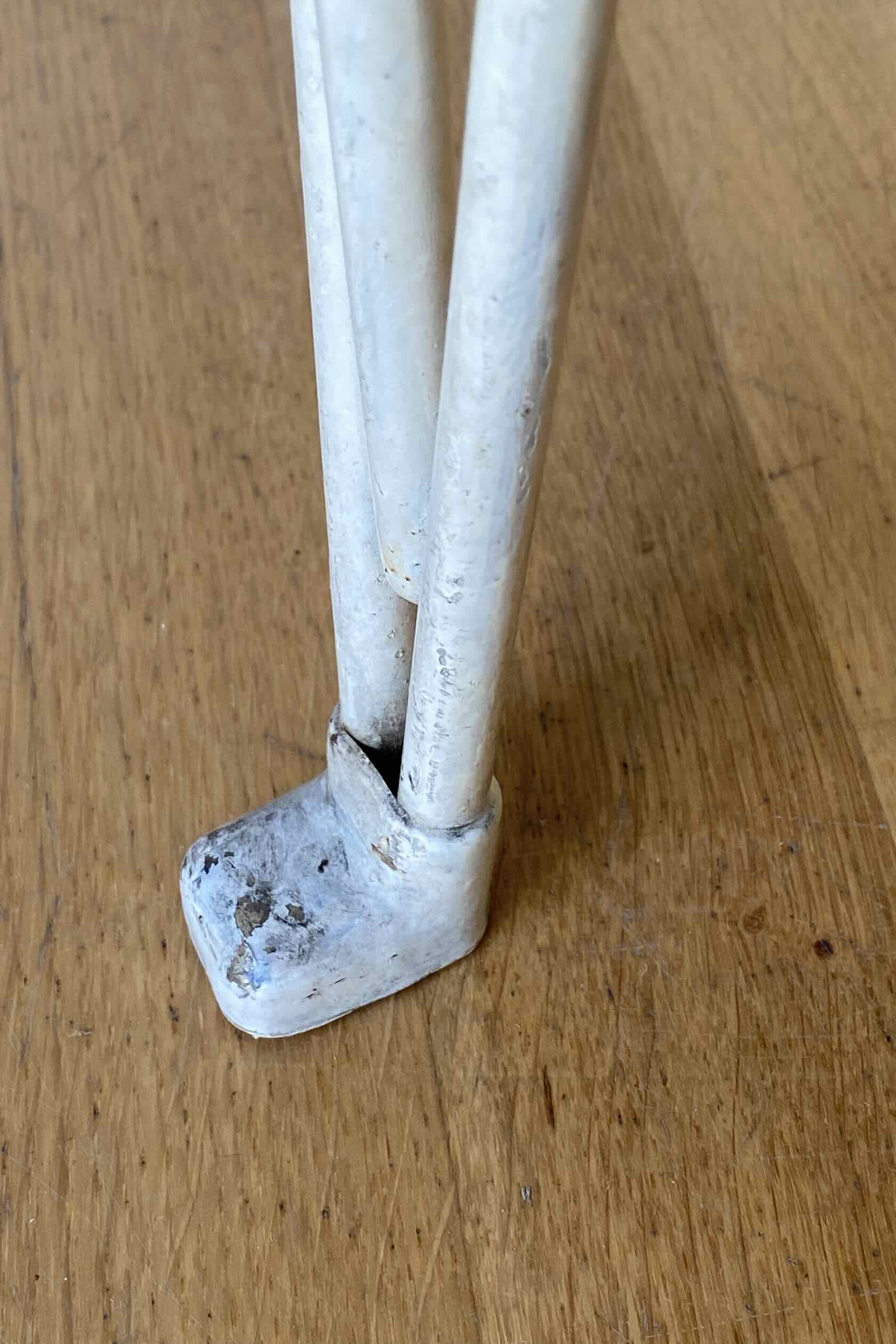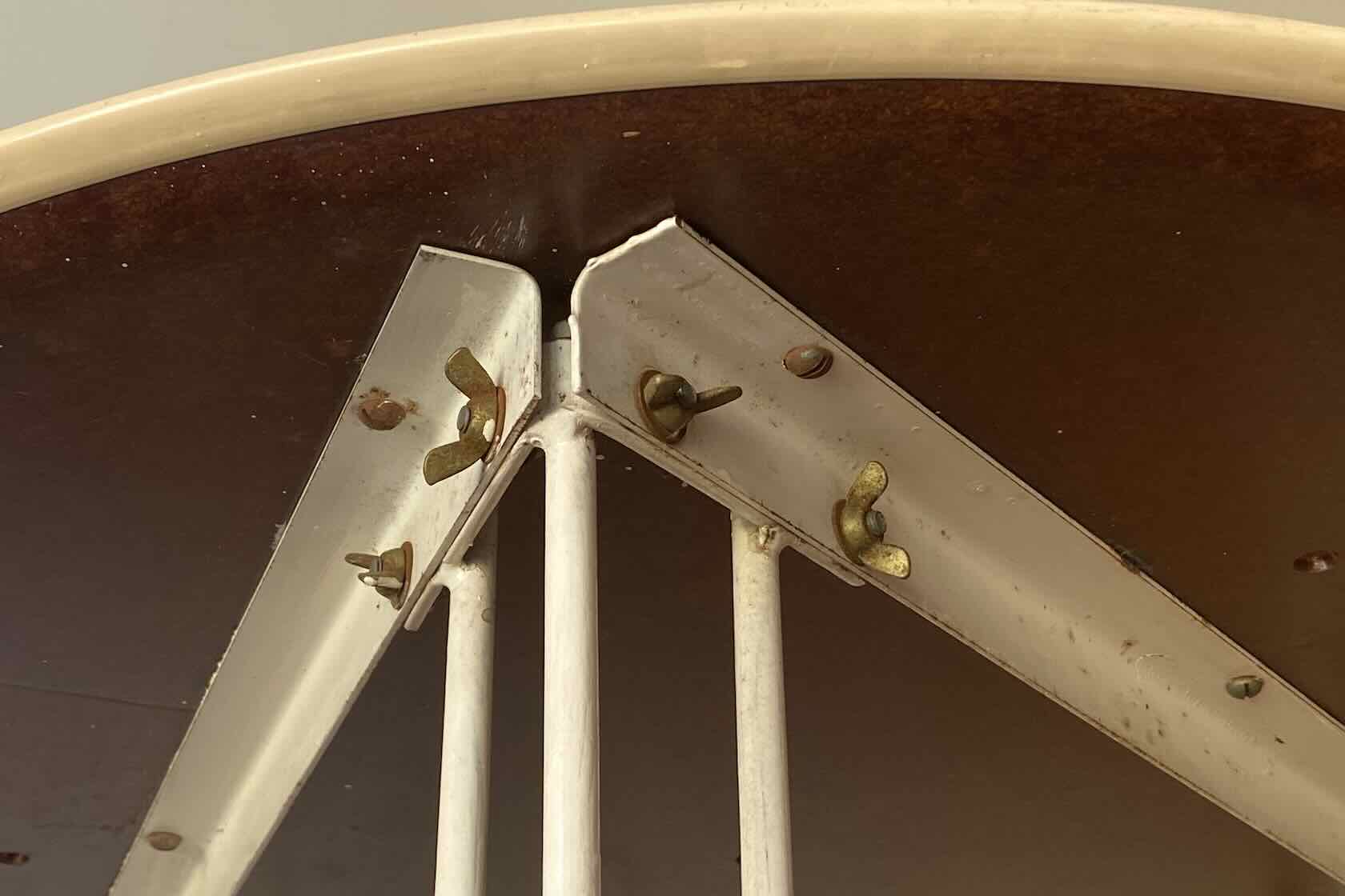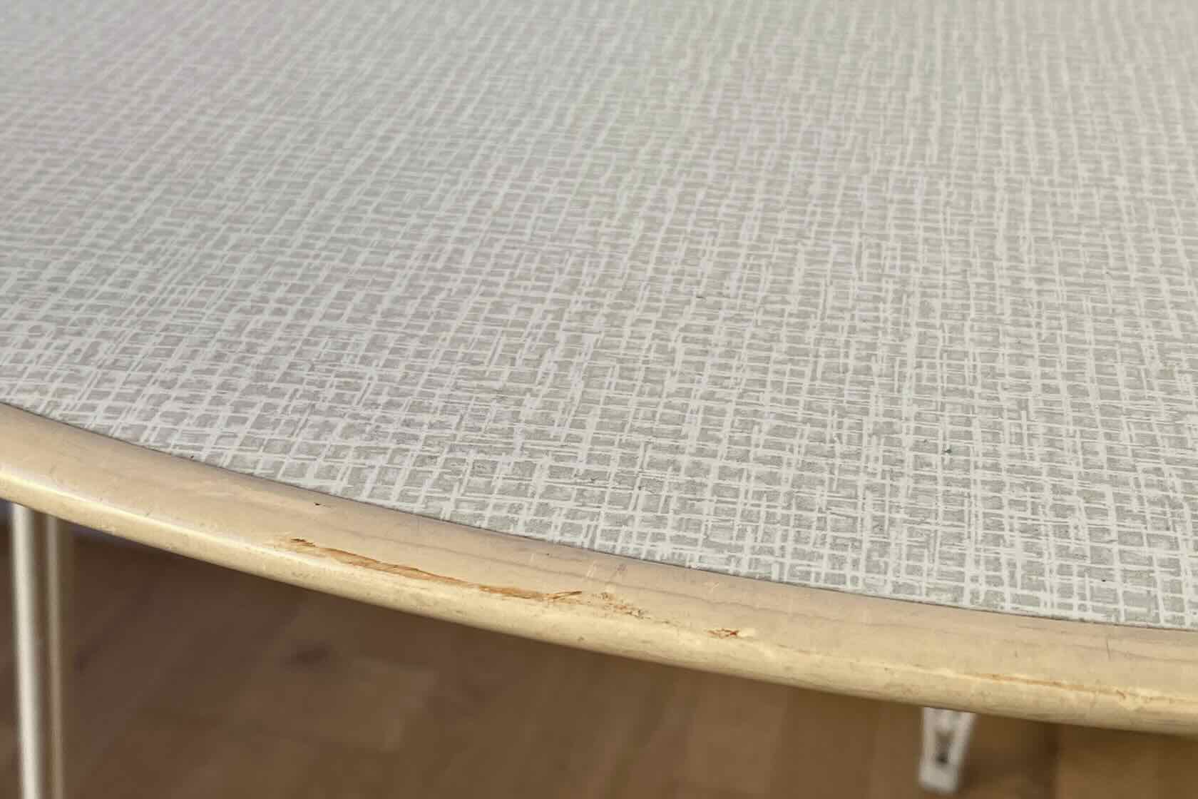 (Garten)Tisch aus den 50er-Jahren (Garten)Tisch aus den 50er-Jahren mit drei Haarnadelbeinen und runder Platte mit hellgrauem Bastdekor. Höhe 68,5cm, Durchmesser 80cm, Gebrauchsspuren (s. Fotos). Preis: EUR 85,00
