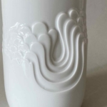 Porzellanvase von Rosenthal, Modell „Zauberflöte“ von Björn Wiinblad aus dem Jahr 1968, mit feinem Relief in Bisquitporzellan sowie glänzend-weißer Glasur. Höhe 16cm, Durchmesser 7,5cm; auf der Unterseite mit einem Schleifstrich, vermutlich aufgrund des Glasurfehlers (s. Foto), deshalb vermutlich nicht gemarkt. Preis: EUR 22,00