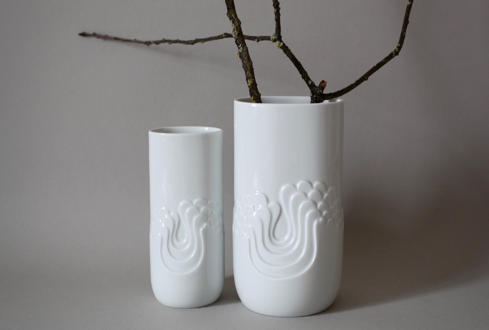 Weiße Porzellanvase von Thomas, in den 60er-Jahren von Tapio Wirkkala entworfen, mit wellenartigem Reliefdekor. Höhe 20cm, Breite 10cm, Tiefe 7,5cm, guter Zustand. Preis: EUR 28,00 (die kleiner Vase ist bereits verkauft)