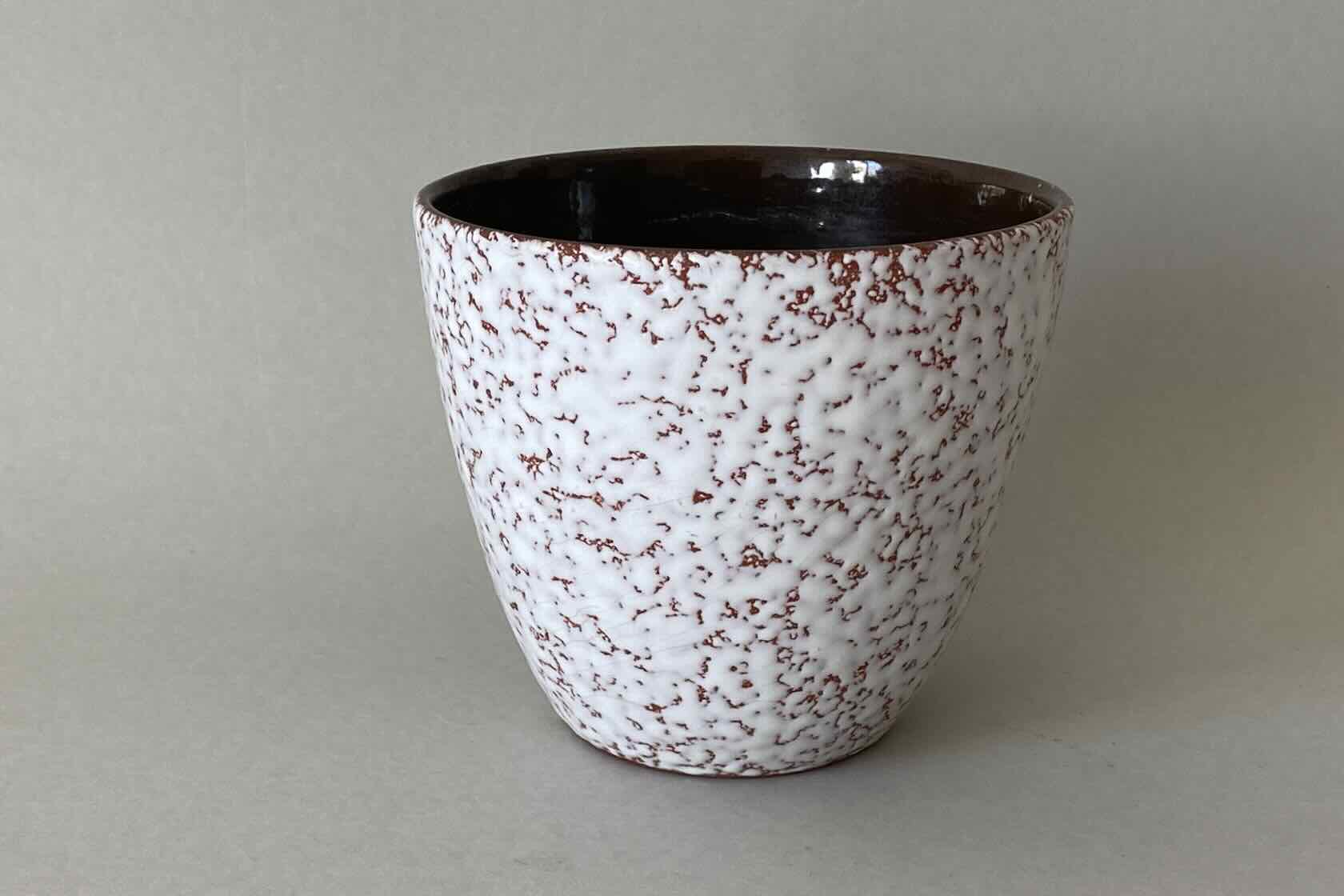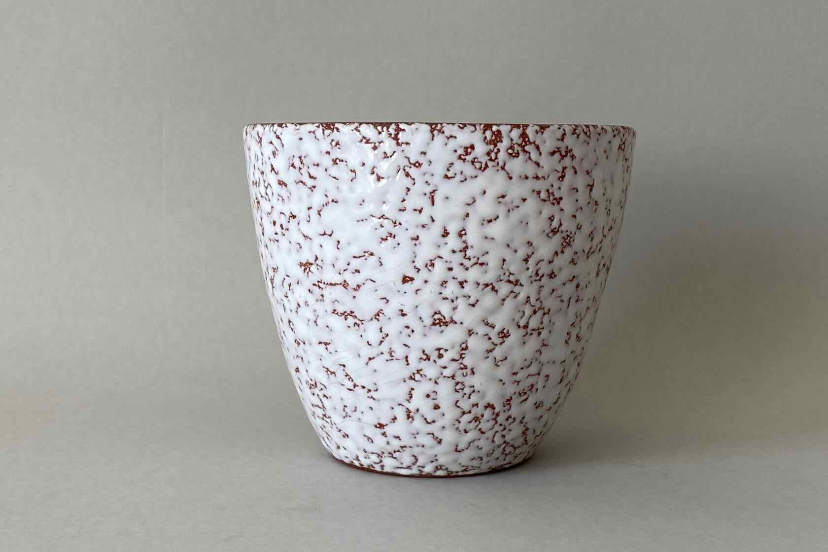 Blumenübertopf aus den 50er-/60er-Jahren aus rotbrauner Keramik mit weißer, lavaartiger Glasur. Höhe 12,5cm, Durchmesser 16cm, guter Zustand. Preis: EUR 28,00