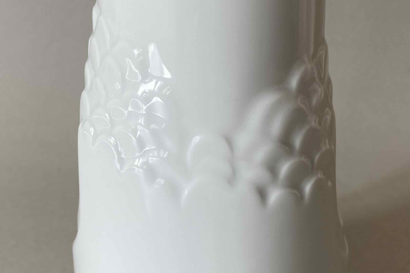 Porzellanvase von Rosenthal, Modell „Zauberflöte“ von Björn Wiinblad aus dem Jahr 1968, mit feinem Relief in Bisquitporzellan sowie glänzend-weißer Glasur. Höhe 16cm, Durchmesser 7,5cm; auf der Unterseite mit einem Schleifstrich, vermutlich aufgrund des Glasurfehlers (s. Foto), deshalb vermutlich nicht gemarkt. Preis: EUR 22,00