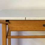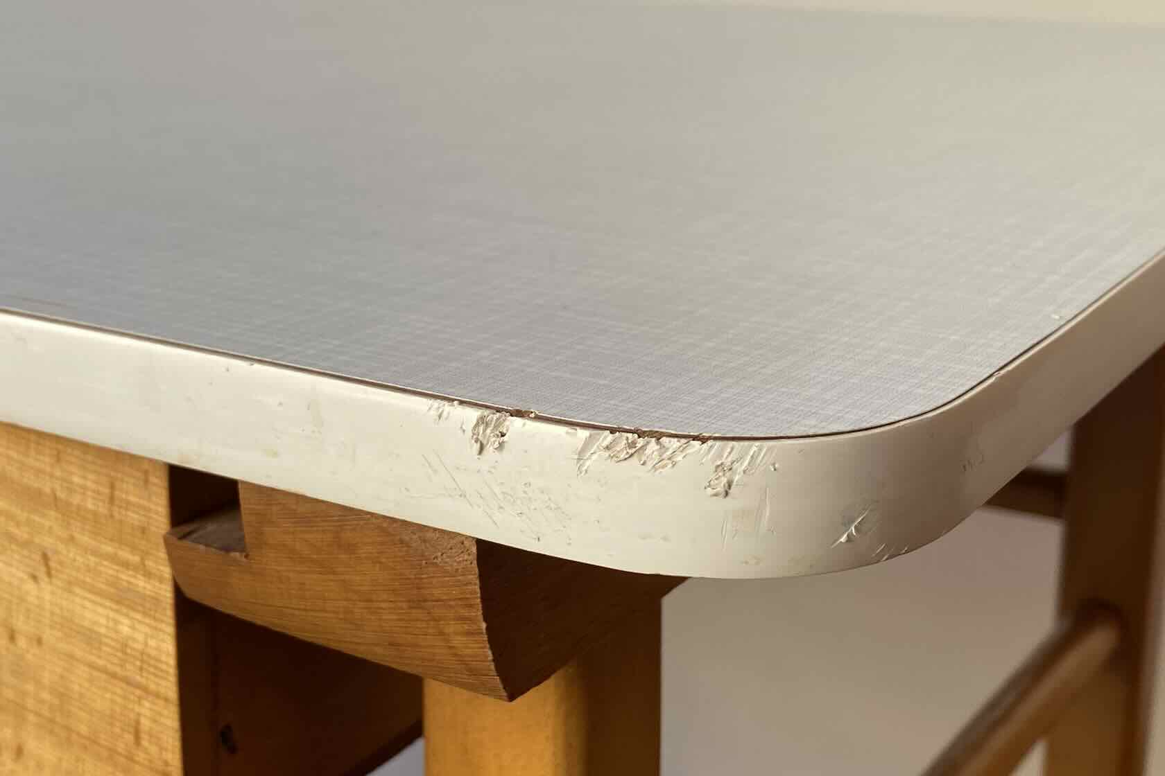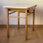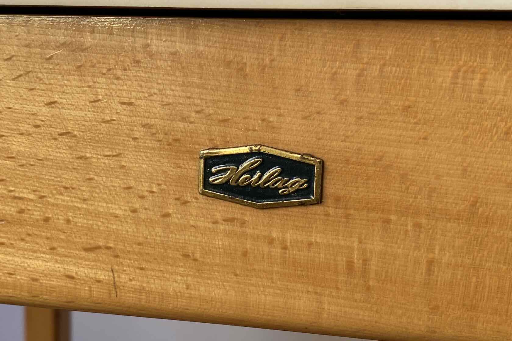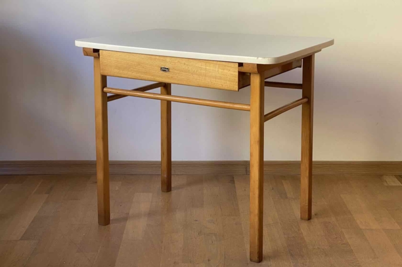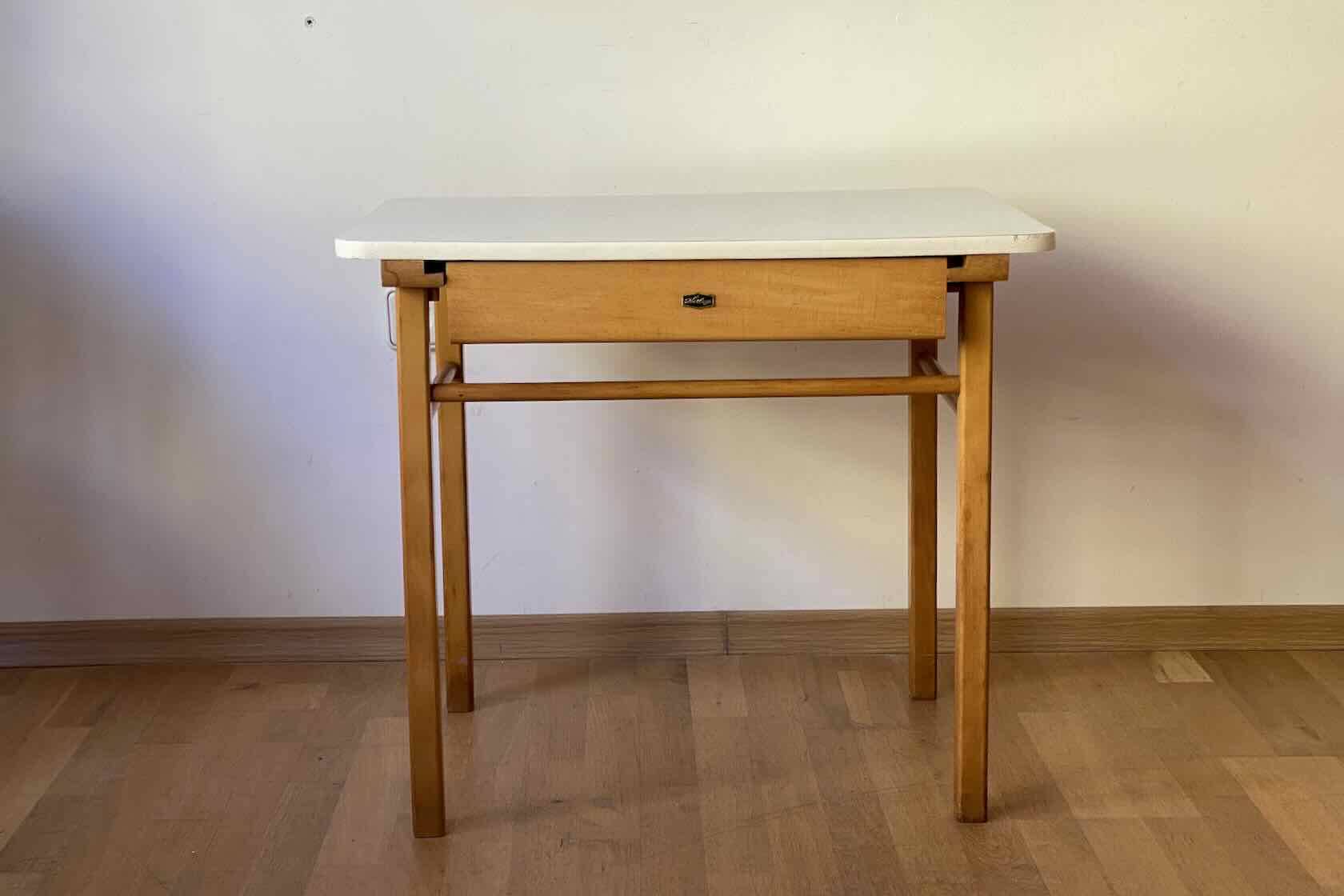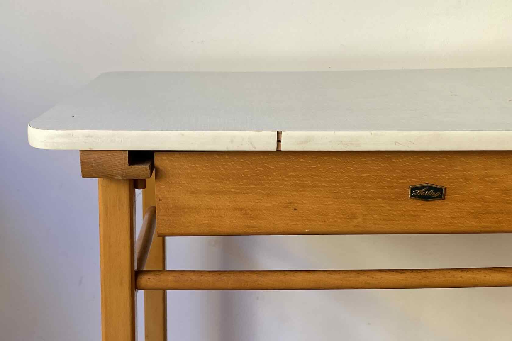 Kindertisch aus den 50er-Jahren von Herlag mit Schublade und grauweißer Resopalplatte. Die Schublade kann in beide Richtungen herausgezogen werden und ist auf beiden Seiten gemarkt. Höhe 57cm, Breite 65cm, Tiefe 45cm, leichte Gebrauchsspuren.