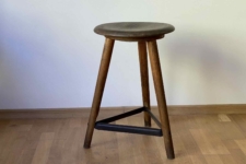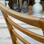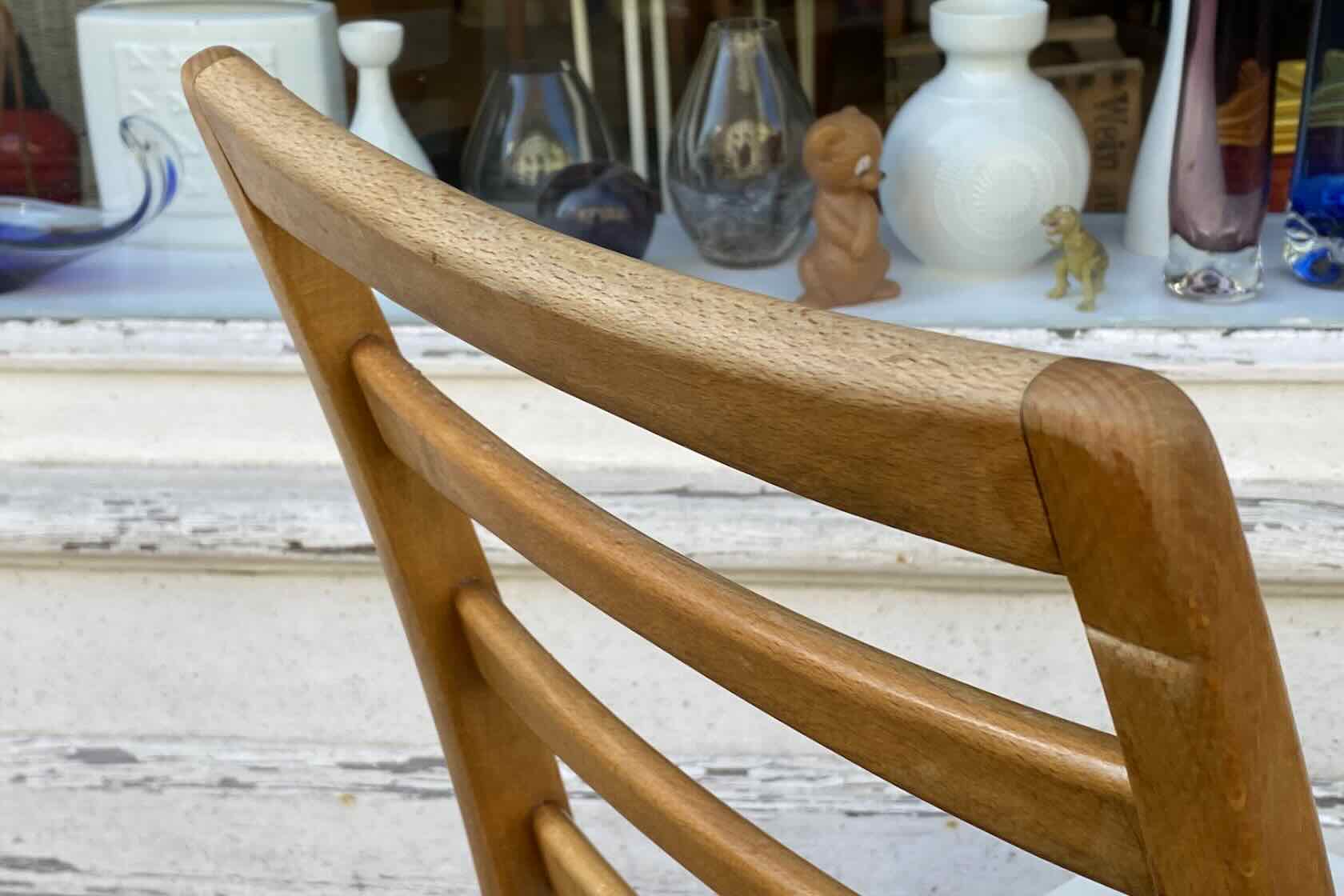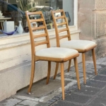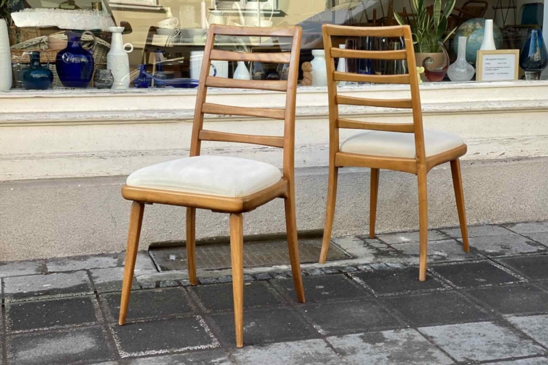 2 Sprossenstühle aus den 50er-Jahren mit Gestell aus Nussbaumholz, Sitzfläche mit Federkernpolsterung und cremeweißem Samtbezug. Sitzhöhe 50cm, Höhe 95cm, Breite 43cm, Tiefe 50cm; leichte Gebrauchsspuren, Polsterung erneuert, Stoff z.T. mit kleinen Flecken.